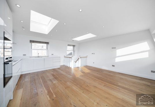 This stunning two-bedroom split-level apartment is located on the top floor of a charming period conversion. The property features wood flooring throughout, a spacious loft-style reception room with an open-plan kitchen, and access to a private terrace.